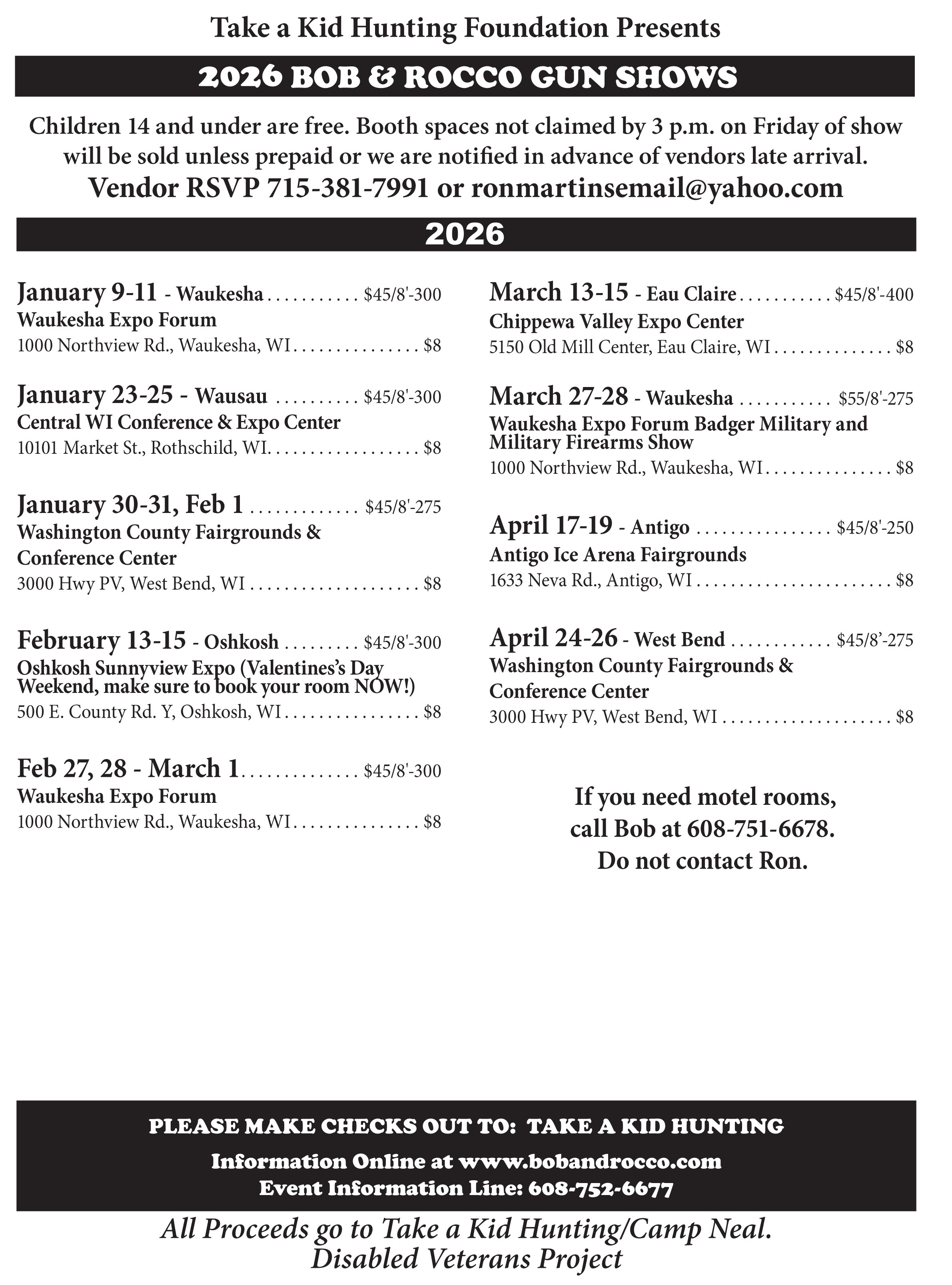 BobandRocco.com is home to the Take a Kid Hunting Foundation which hosts the Bob and Rocco Gun Shows & Badger Military Collectible Shows. At our shows you can buy, sell or trade firearms, ammo, knives and much more from over 75 dealers and collectors in one location. Unlike most gun shows, the Bob and Rocco Gun Shows are hosted by a fund raising 501 (c)(3) non-profit organization for the benefit our youth and disabled American veterans. Please click on our 'Camp Neal' link and read about our very exciting and upcoming recreational facility/campground which will be available to our disabled vets and kids to enjoy at no cost. Keep checking back to see our progress and for information on how to access this facility.